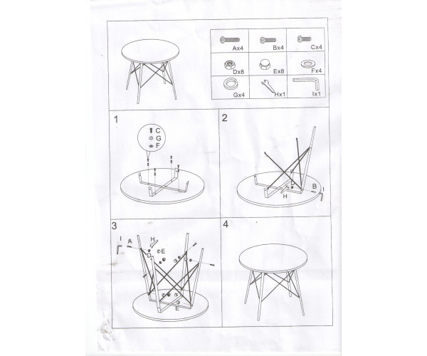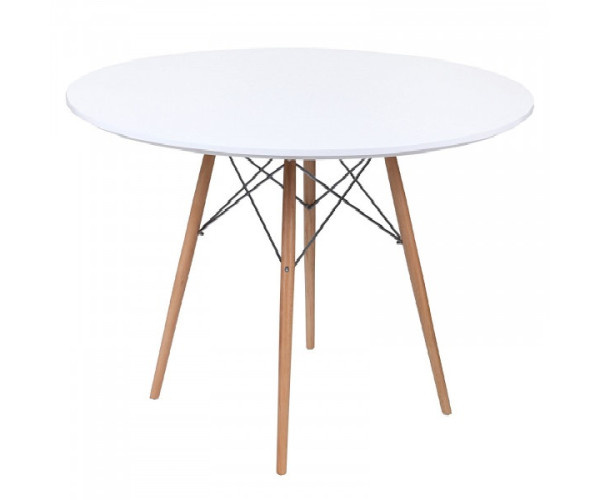 Обідній стіл круглий, стільниця з матеріалу ламінований МДФ, товщина стільниці 15 мм, дерев'яні ніжки з натурального дерева бук, відтінок світлий, дерев'яні частини ніжок з'єднуються за допомогою металевих прутів чорного кольору, розмір столу: діаметр 100 см, висота столу 72 см.