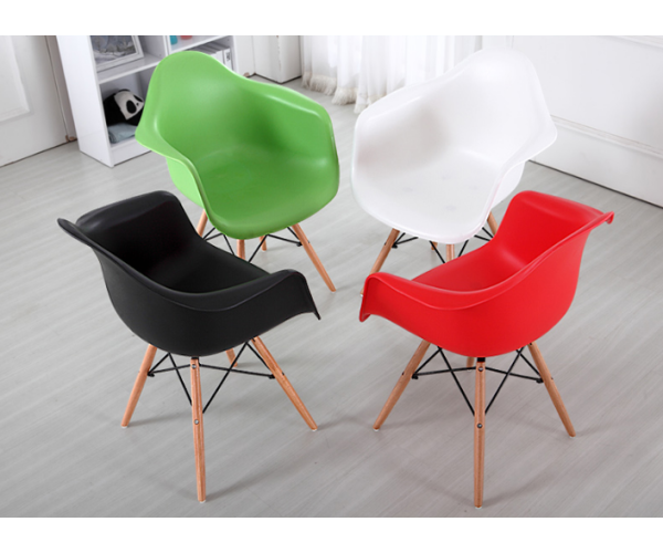 Крісло пластикове, матеріал поліпропилен, ніжки виготовлені з дерева світлого відтінку, матеріал бук, на ніжках встановлені пластикові заглушки для запобігання подряпин на поверхні підлоги, розміри крісла: ширина сидіння 62 см, глибина сидіння 62 см, висота посадки від підлоги до сидіння 41 см, висота від підлоги до верхнього краю спинки 80 см. Цей стілець придумали більше півстоліття тому і він досі залишається одним із найзручніших стільців у світі. Свого часу він став першим стільцем із пластику, і саме з нього почалася мода на доступні дизайнерські меблі. Унікальність стільців у стилі Eames – це висока функціональність та універсальність сучасного стилю, що дозволяє використовувати його в абсолютно різних за дизайном та призначенням приміщеннях. Кількість у коробці: 4 од.