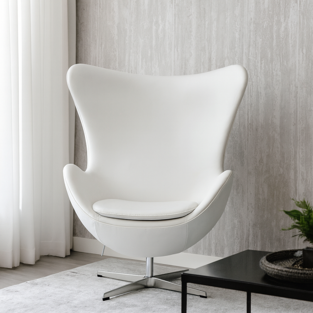 Елегантне та комфортне дизайнерське крісло Егг — ідеальне поєднання сучасного стилю, якості та зручності. Його продумана ергономіка та витончений дизайн гармонійно впишуться як в офісний простір, так і в домашній інтер’єр. Матеріал оббивки високоякісна екошкіра, приємна на дотик, стійка до зношування та легка у догляді, наповнювач це щільний пінополіуретан, регулюється кут нахилу спинки у двох положеннях — для роботи та відпочинку, а міцна хрестовина з полірованого алюмінію додає блиску та надійності конструкції. Крісло обертається навколо своєї осі, висота сидіння фіксована без підйомного механізму. Розмір крісла: ширина спинки вгорі 80 см, ширина по підлокітникам 77 см, висота спинки 69 см, висота від підлоги до сидіння 44 см, висота загальна від підлоги до верху спинки 110 см.
